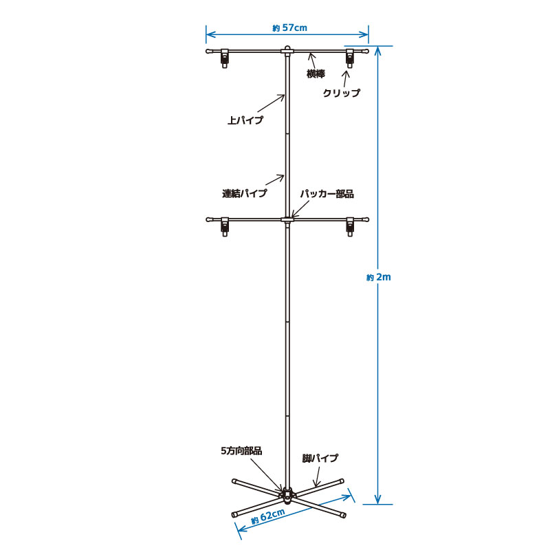 | 本体サイズ | 設置時サイズ:約W570×H2000×D630mm(最大時) (横棒:285mm×4本、連結パイプ:凸部含め460mm×4本、上部パイプ:400mm×1本、脚パイプ:300mm×4本、縦・脚パイプ外径:16φ) 箱サイズ:D105×H70×W465mm |