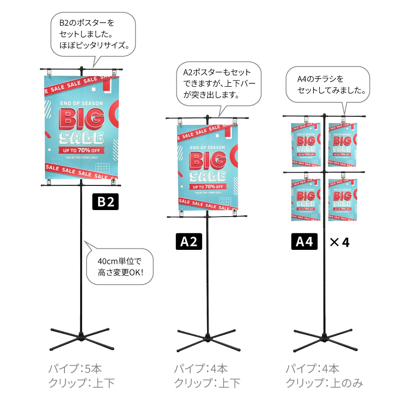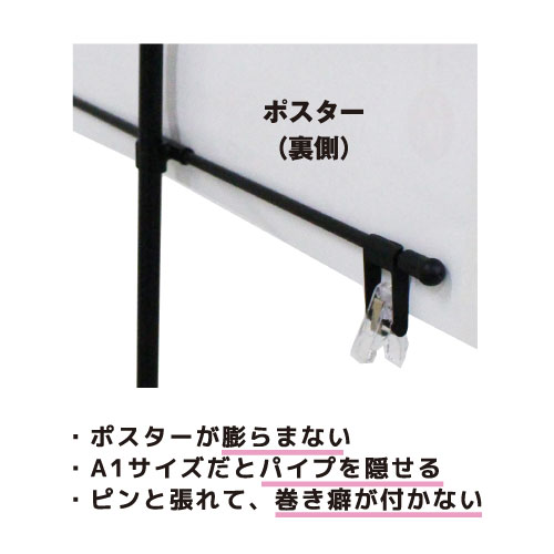 | 注意 | ※設置時は脚に荷物など重りになるものを置いてご使用ください。 ※ポスターは付属しておりません。 ※クリップや横棒のパーツ販売は行っておりません。 |
